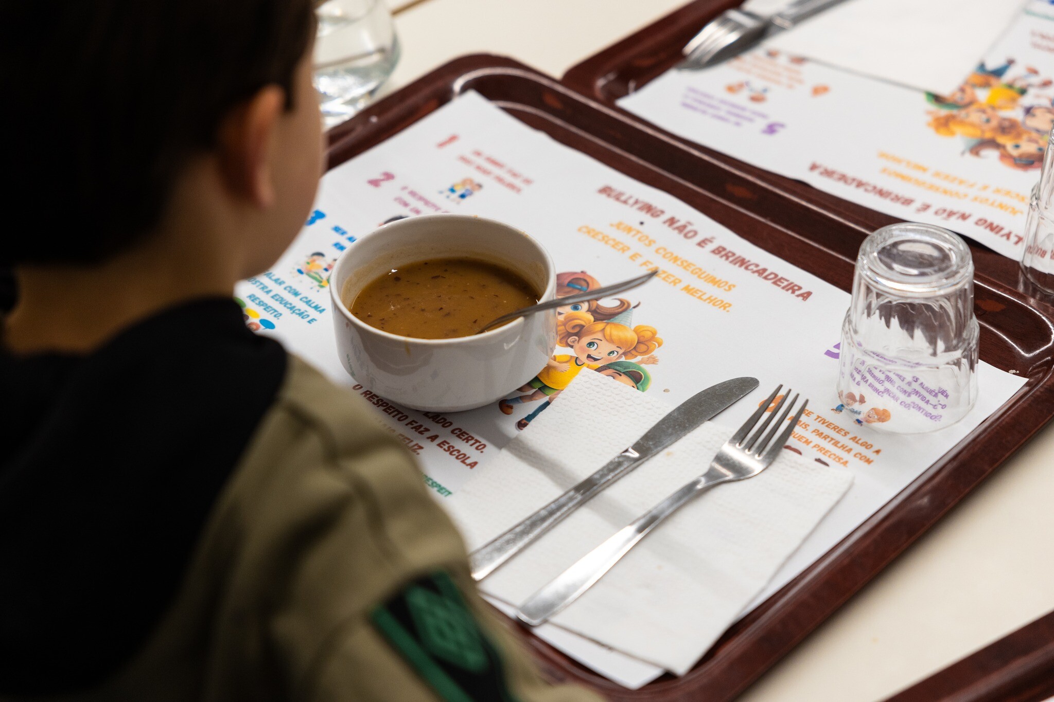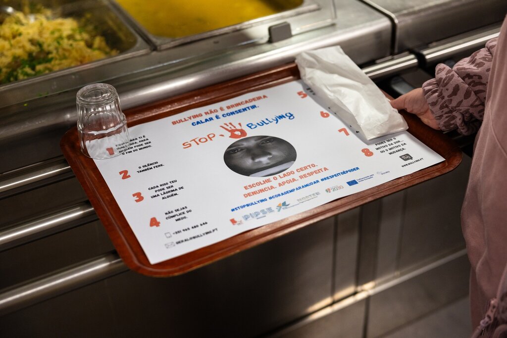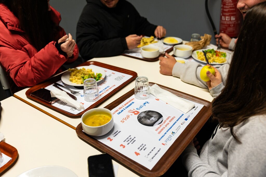 Nesse sentido, foi dinamizada uma ação de sensibilização através da personalização dos toalhetes utilizados nos tabuleiros do almoço escolar. As mensagens e imagens ilustrativas presentes nos toalhetes procuraram incentivar a amizade, o respeito mútuo e a valorização do outro, transformando um momento do quotidiano escolar numa oportunidade de reflexão e aprendizagem.