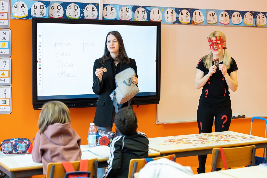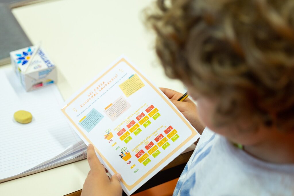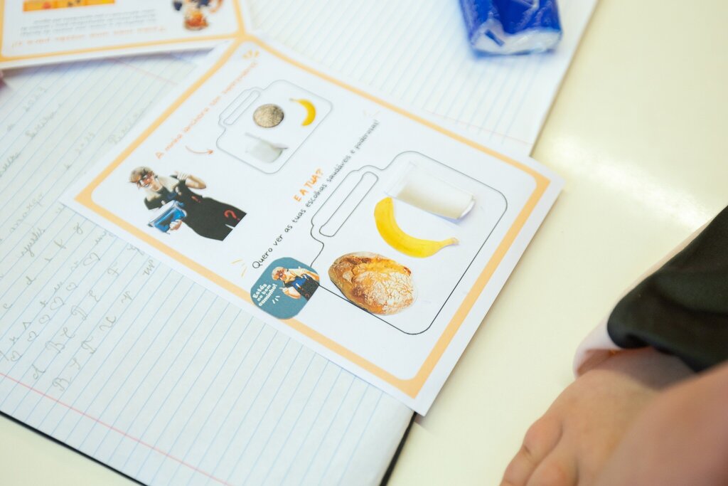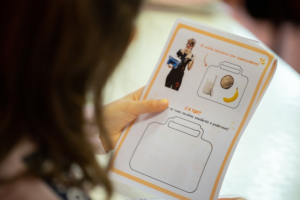 Através de um jogo lúdico, os alunos foram desafiados a selecionarem os alimentos que lhes conferem superpoderes e a auxiliarem a LadyTag a construir uma lancheira saudável.